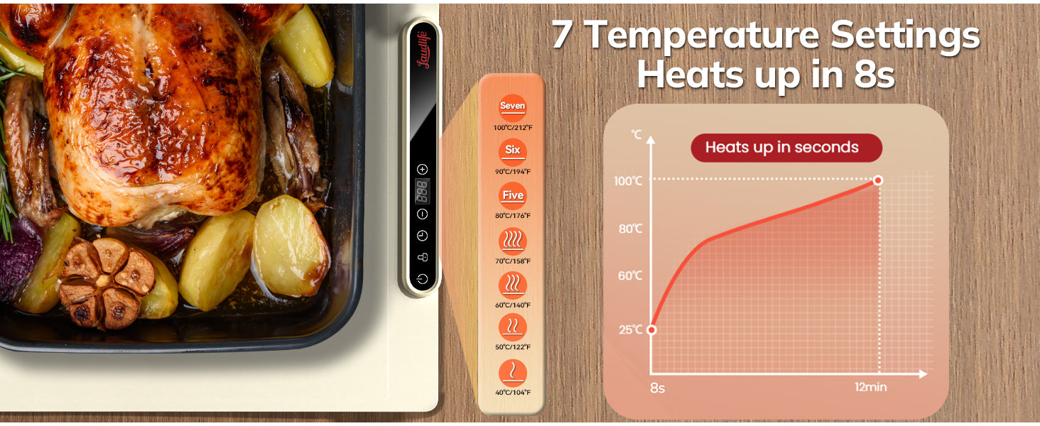 Multiple Temperature Control — Features 7 adjustable temperature levels from 40–100 °C (104–212 °F) to keep dishes perfectly warm.