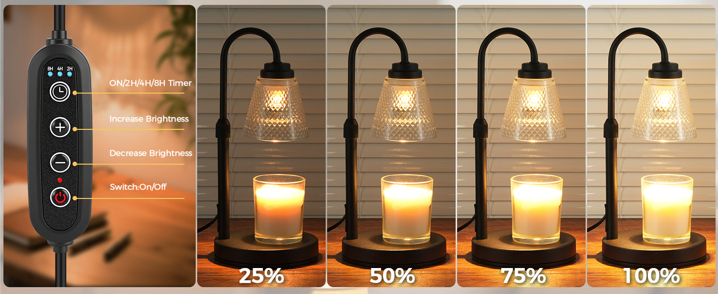 Custom Timer & Brightness Control — Choose 2H, 4H, or 8H auto-shutoff combined with four dimming levels to set the perfect mood and save candle wax. Tailor the lighting and scent intensity to any occasion.